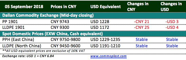 Total inventories at Sinopec and CNPC’s warehouses digested 30,000 tons from the previous trading day to 780,000 tons as on 05 September 2018. (Correction: Total inventories on 4 September 2018 was 810,000t tons)