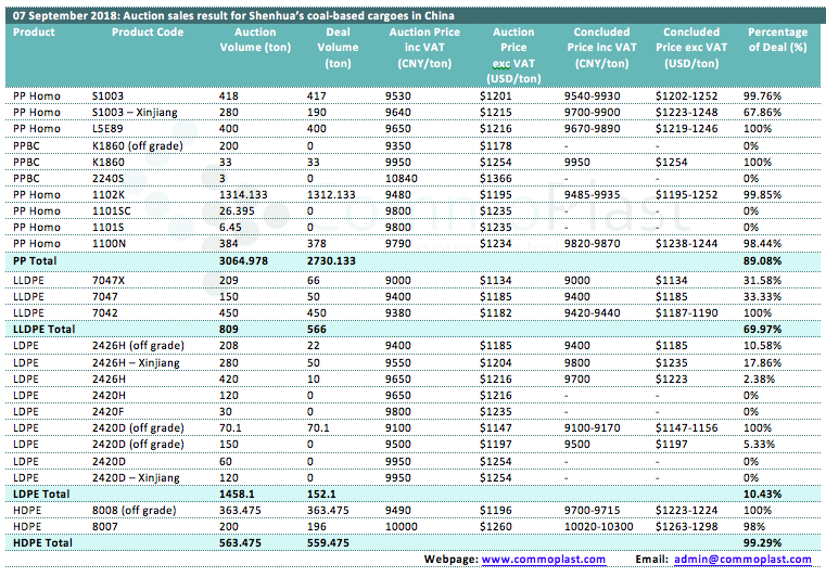 07 September 2018: Auction sales result for Shenhua's coal-based cargoes in China