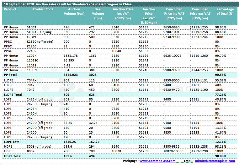 10 September 2018: Auction sales result for Shenhua's coal-based cargoes in China