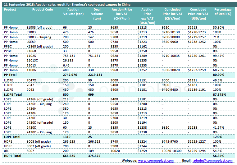 Auctions sales result for Shenhua’s coal-based polyolefin products in domestic China are as following: