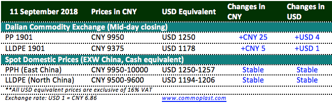 Total inventories at Sinopec and CNPC’s warehouses reduced 25,000 tons from the previous trading day to 770,000 tons as on 11 September 2018. (Correction: total inventories were at 795,000 tons on 10 September 2018)