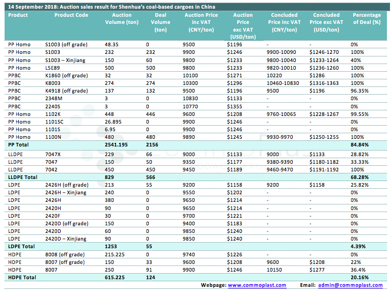 Auctions sales result for Shenhua’s coal-based polyolefin products in domestic China are as following: