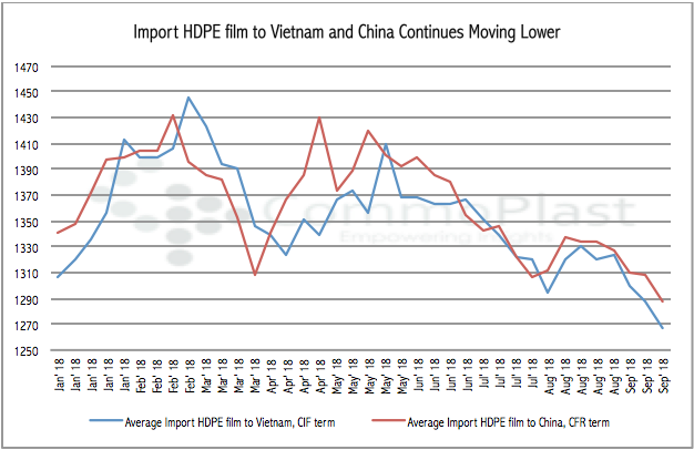 Compared to the final week of August, the average import HDPE film price based on CIF Vietnam has dropped more than $55/ton and CFR China value dropped $40/ton. Apparently, cargoes priced above the $1300/ton threshold are now facing tremendous difficulty in attracting deals.