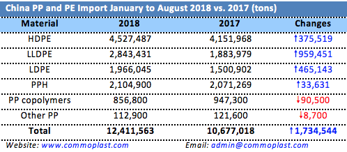 China registered 16.2% hike or more than 1.7 million tons in the total PP and PE import arrival for the period January to August 2018 compared to the same duration last year. Players said that one of the factors contributing to such surge is the absence of the recycled materials resulted from the ban on plastics scraps.