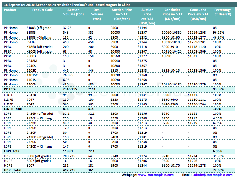 18 September 2018: Auction sales result for Shenhua's coal-based cargoes in China
