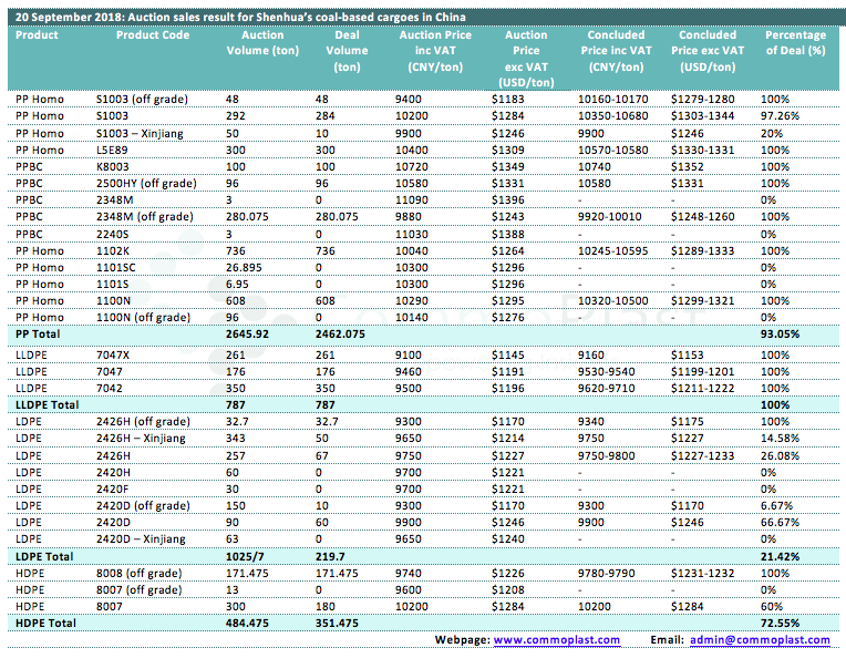 20 September 2018: Auction sales result for Shenhua's coal-based cargoes in China