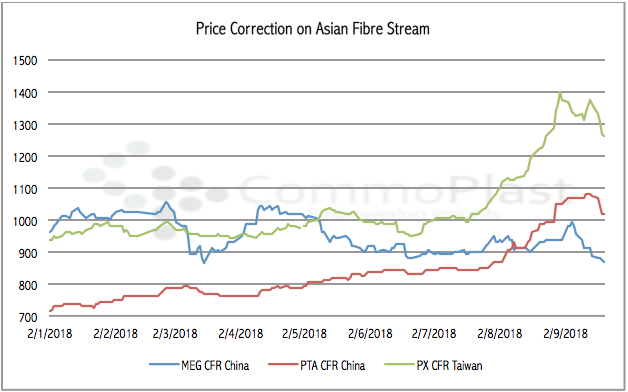 The Asian PX market that was riding the high tide to the record high levels during late August amid strong demand from the fiber sector, which prompted expectation that market would remain strong with additional support from tightening supply. However, the brief rebound did not sustain. Asian PX costs based on CFR China/Taiwan fell $108/ton in a period of 7 days to $1264/ton on 20 September 2018, according to CommoPlast data.