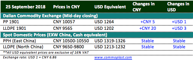 Dalian Commodity Exchange resumes trading after the long weekend on a firm note. Both contracts for PP and LLDPE recorded some small increases by the time market enter the break-time.