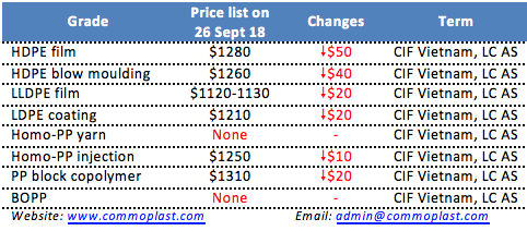 It is reported that another major Saudi Arabia producer has announced October shipment offers for both PP and PE to Vietnam at lower levels compared to last month.