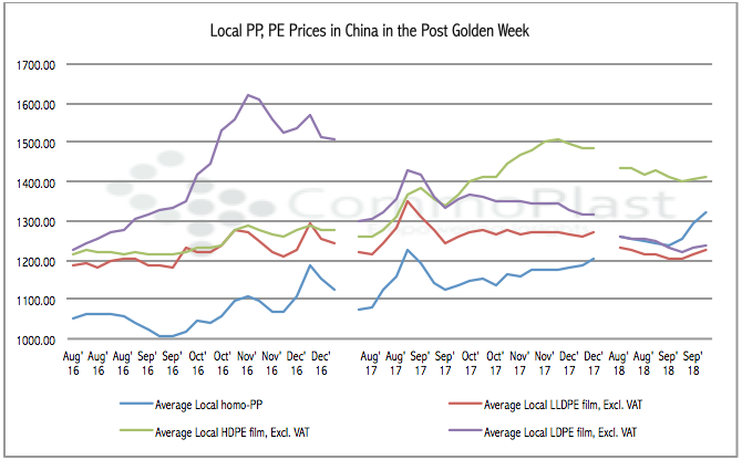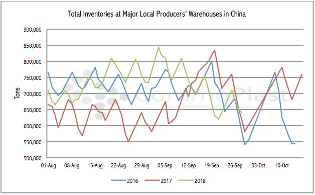 From the supply point of view, total PP and PE inventories at Sinopec and CNPC’s warehouses did not fall sharply during the pre-holiday period as it did in 2016 and 2017. Data showed that by 28 September 2018, total inventories stood at 640,000 tons, while in 2016, this figure has fallen to 555,000 tons and in 2017 to 580,000 tons.