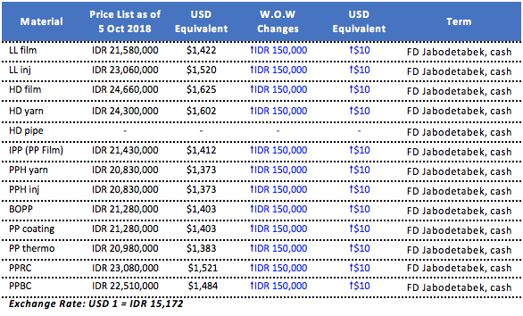Indonesian buyers have received the third price adjustment this week for PP and PE from a major local producer as the Indonesian Rupiah continue to depreciate against the US dollar. The latest price hike elevates both PP and PE prices by additional IDR150,000/ton ($10/ton from the previous offers on 2 October.
