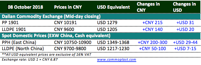 On the first trading day after the weeklong National Day, both futures contracts for PP and LLDPE on Dalian Commodity Exchange recorded impressive gain. Firm futures market coupled with tight availability, spot ground also sees higher price levels, especially for homo-PP cargoes.