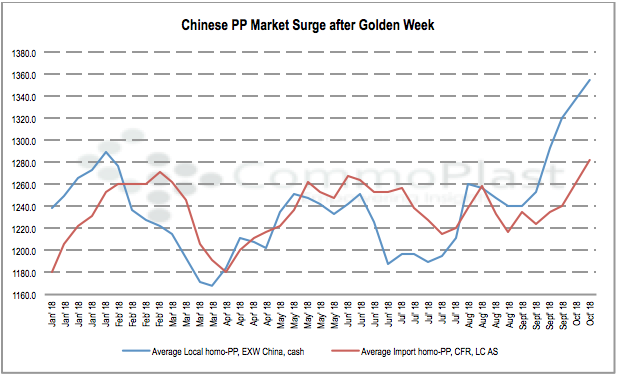 The Chinese PP market extended the firming trend on the first trading day after the weeklong National Day holiday, which is much in line with the initial expectation. Compared to the pre-holiday week, import homo-PP yarn gains an average USD42/ton while local market surges USD35/ton, data from CommoPlast showed. An important point to note is that buying interest remains strong regardless of the fact that local prices have hit the all-time high this year, prompting fear that the peak might be very near.