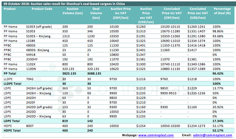 Auctions sales result for Shenhua’s coal-based polyolefin products in domestic China are as following: