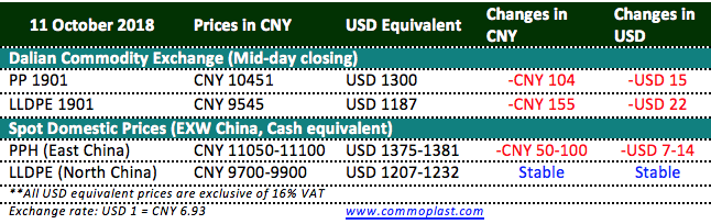 The rally on Dalian Commodity Exchange finally takes a break, which market thought to be a technical correction. Spot suppliers are pretty prompt in responding to the latest development by offering CNY50-100/ton ($7-14/ton) discount on PP cargoes.