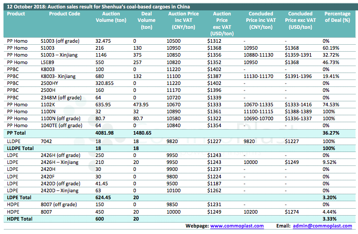 12 October 2018: Auction sales result for Shenhua's coal-based cargoes in China