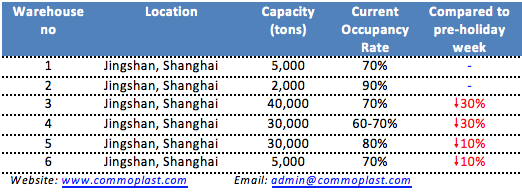 CommoPlast team on 17 October 2018 conducts a warehouse survey in six pre-determined warehouses around the Shanghai area with the main objective of obtaining insights into the inventories pressure among local traders here.