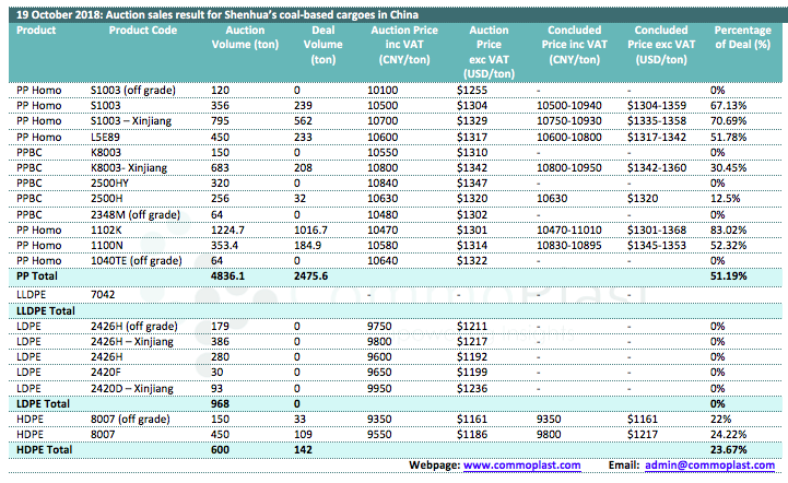 Auctions sales result for Shenhua’s coal-based polyolefin products in domestic China are as following: