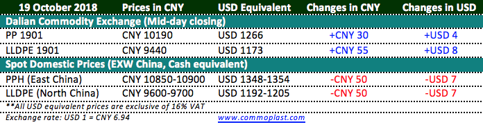 Total inventories at Sinopec and CNPC’s warehouses piled up 5,000 tons from yesterday at 775,000 tons as on 19 October 2018. This is the second sessions in a row that inventories build up instead of digesting.