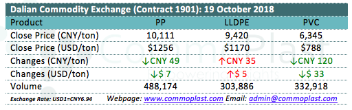 Contract number 1901 on Dalian Commodity Exchange on 19 October 2018 settled as following: