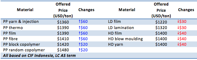 It is reported that a major Malaysian producer has announced fresh PP and PE offers to Indonesia with up to $60/ton hike on homo-PP grades while PE is tracking lower.
