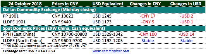Total inventories at Sinopec and CNPC’s warehouses digested another 35,000 tons day on day, to 775,000 tons as on 24 October 2018.