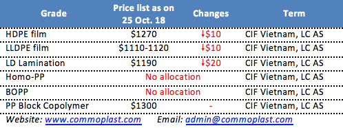 It is reported that another major Saudi Arabia producer has announced November shipment offers for PP and PE to Vietnam with $10-20/ton reduction from last month.