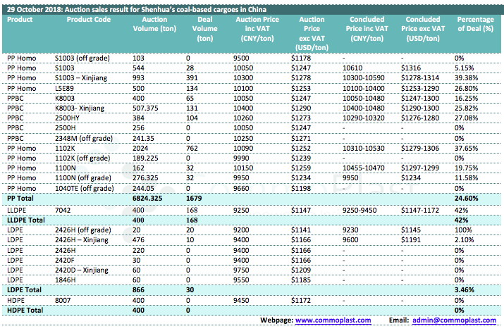 Auctions sales result for Shenhua’s coal-based polyolefin products in domestic China are as following:
