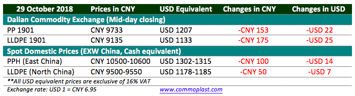 Dalian Commodity Exchange poses significant weak trend throughout the morning session since opening time whereby PP futures hitting the lowest level since 12 September 2018 while LL futures breached below the lowest level of 12 September, creating new low price since 17 July 2018. Details on the spot and futures prices are shown in the following table: