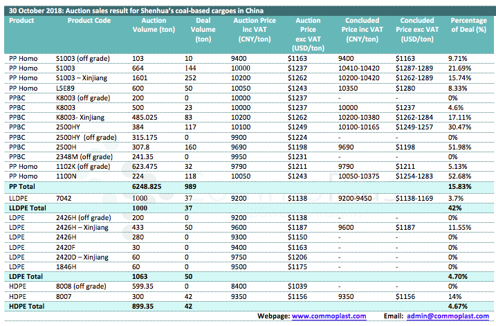 Auctions sales result for Shenhua’s coal-based polyolefin products in domestic China are as following: