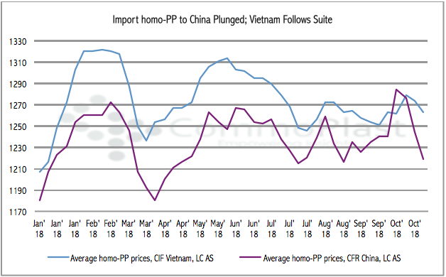 As on 2 November 2018, import offers for homo-PP from dutiable and non-dutiable origins stood at $1190-1270/ton CFR China, LC 0 – 30 days term, down approximately $65/ton on an average compared to the second week of October, data from CommoPlast showed.