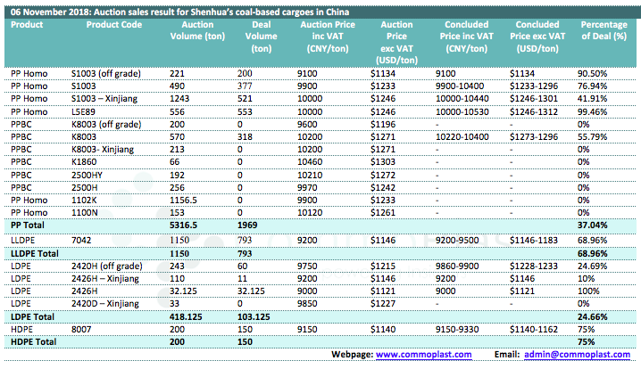 06 November 2018: Auction sales result for Shenhua's coal-based cargoes in China