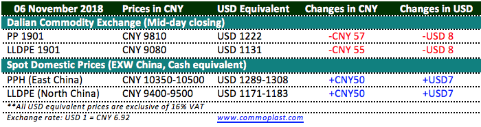 Total inventories at Sinopec and CNPC’s warehouses reduced 40,000 tons from yesterday to 795,000 tons as on 06 November 2018. (Correction: Inventories on 5 November as at 835,000 tons)