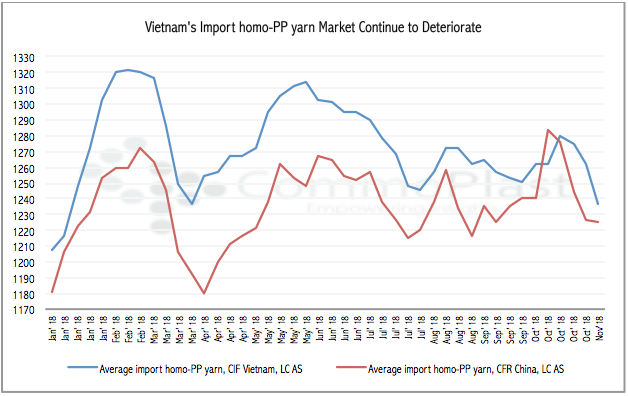 The import homo-PP market in Vietnam continues to deteriorate following the latest plunge in China and the weakness in the upstream propylene costs. By the week ending 9 November 2018, the average import homo-PP yarn to Vietnam slipped to the lowest level since late March and potentially endures further reduction in the near term.