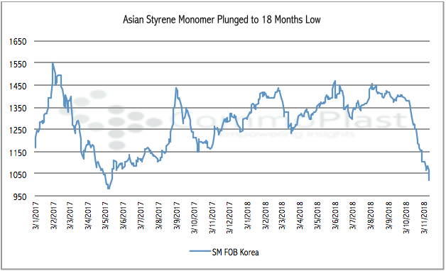 Looking at the upstream market, styrene monomer (SM) plunged to the lowest level in 18 months this week, drag by the lengthy supply condition. Compared to a month ago, SM cost based on FOB South Korea term loses more than $300/ton.