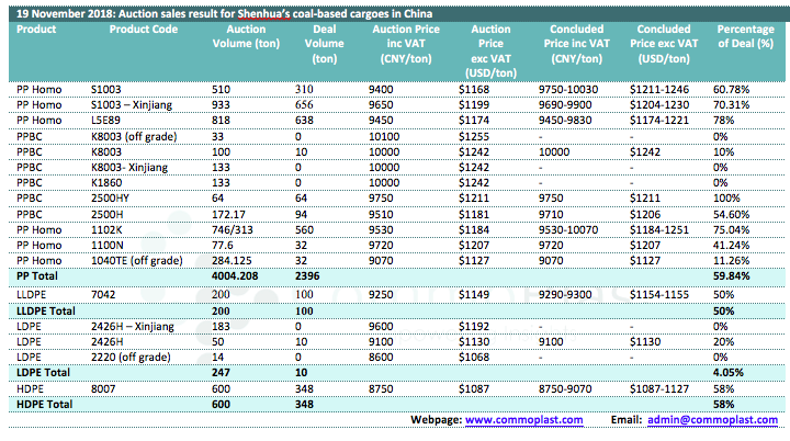 19 November 2018: Auction sales result for Shenhua's coal-based cargoes in China