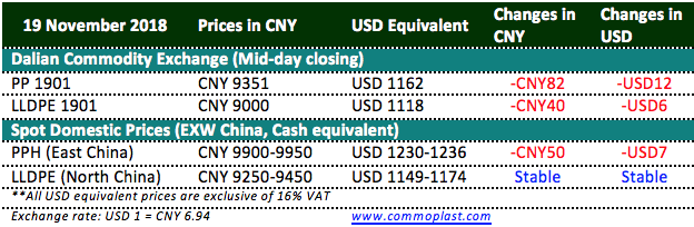 Total inventories at Sinopec and CNPC’s warehouses piled up 65,000 tons over the weekend to 870,000 tons as on 19 November 2018.