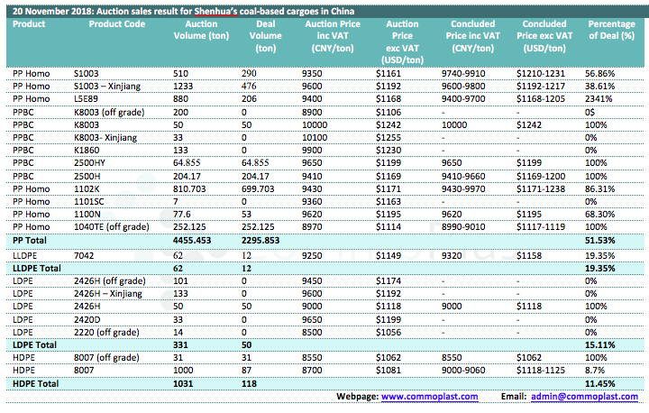 20 November 2018: Auction sales result for Shenhua's coal-based cargoes in China