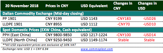 Total inventories at Sinopec and CNPC’s warehouses digested 45,000 tons from yesterday to 825,000 tons as on 20 November 2018.