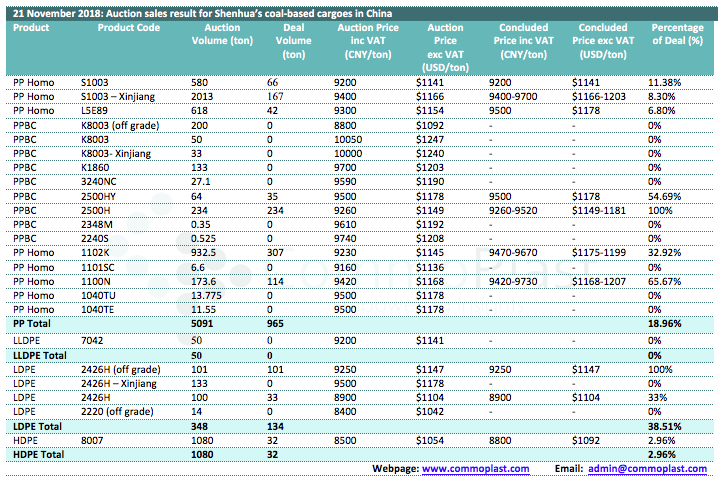 21 November 2018: Auction sales result for Shenhua's coal-based cargoes in China