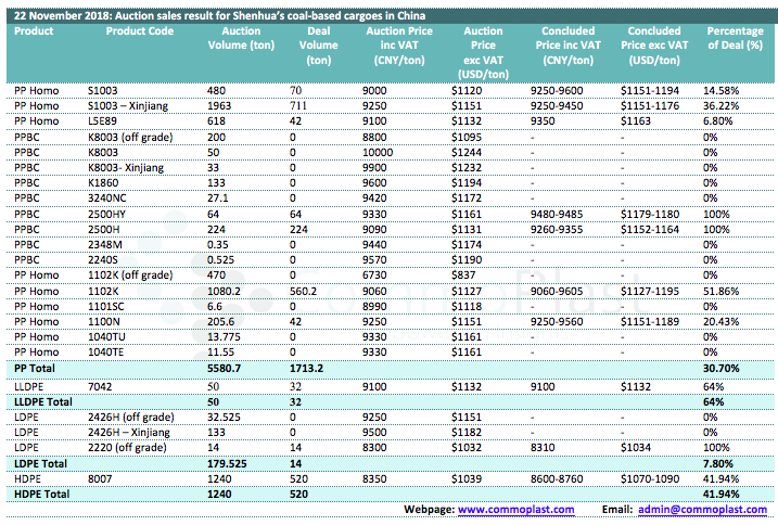 Auctions sales result for Shenhua’s coal-based polyolefin products in domestic China are as following: