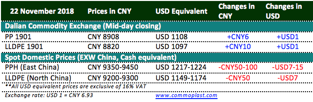 Total inventories at Sinopec and CNPC’s warehouses unchanged from the previous trading day at 800,000 tons as on 22 November 2018.