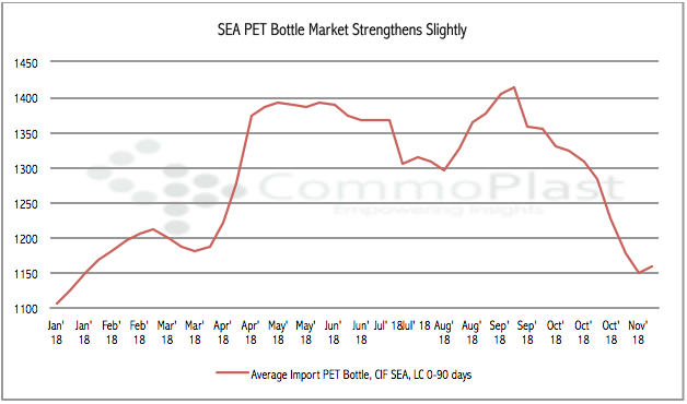 The import PET market in Southeast Asia has been on the downtrend for nine consecutive weeks since mid of September, shredding more than USD 250/ton from its peak to an average of $1150/ton CIF Southeast Asia by the week ending 16 November 2018.