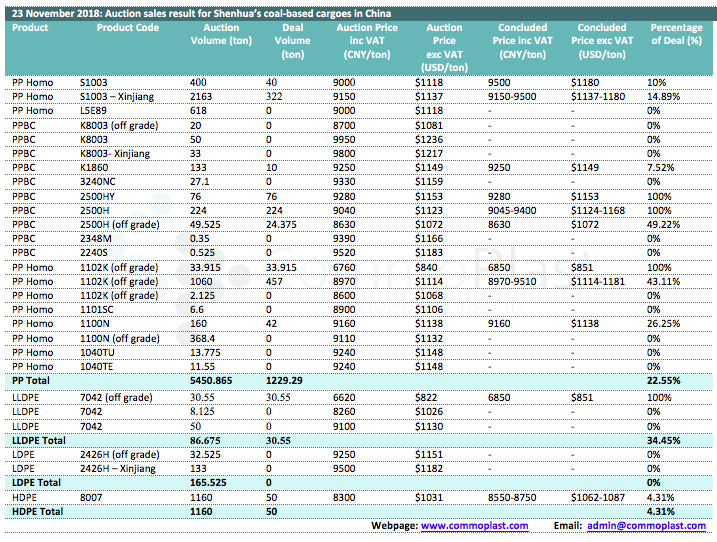 Auctions sales result for Shenhua’s coal-based polyolefin products in domestic China are as following: