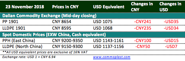 Total inventories at Sinopec and CNPC’s warehouses piled up 10,000 tons from yesterday to 810,000 tons as on 23 November 2018.