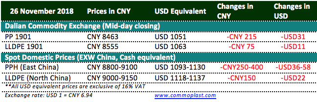 Total inventories at Sinopec and CNPC’s warehouses piled up 50,000 tons from last Friday to 860,000 tons as on 26 November 2018.