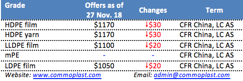 Chinese buyers reportedly receiving fresh PE offers from a major Thailand producer with another $20-30/ton reduction from last week as sentiment here continues to wean.