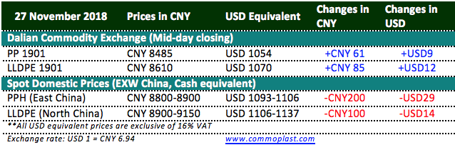 Total inventories at Sinopec and CNPC’s warehouses digested 40,000 tons from the previous trading day to 820,000 tons as on 27 November 2018.