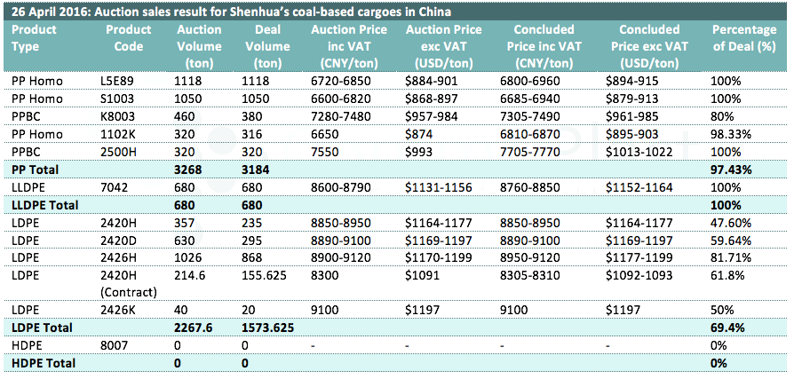 26 April 2016: Auction sales result for Shenhua's coal-based cargoes in China