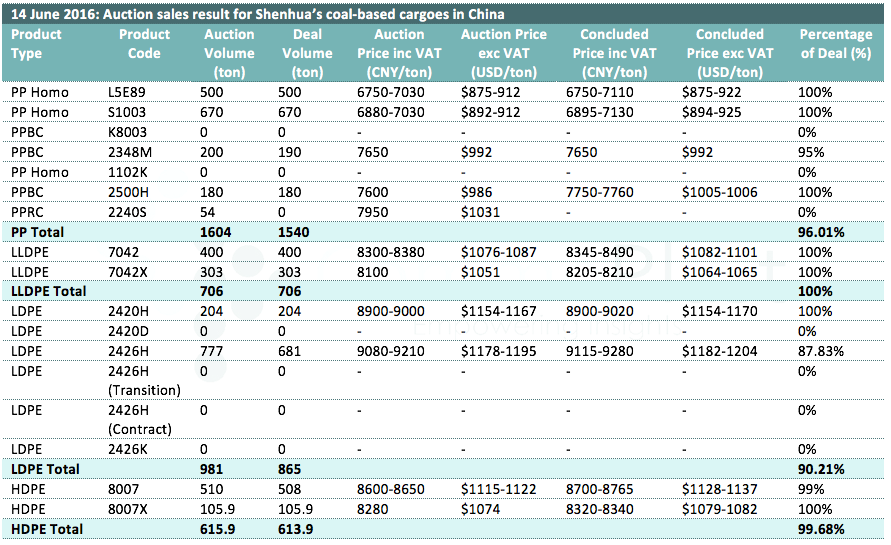 Auctions sales result for Shenhua’s coal-based polyolefin products in domestic China are as following: